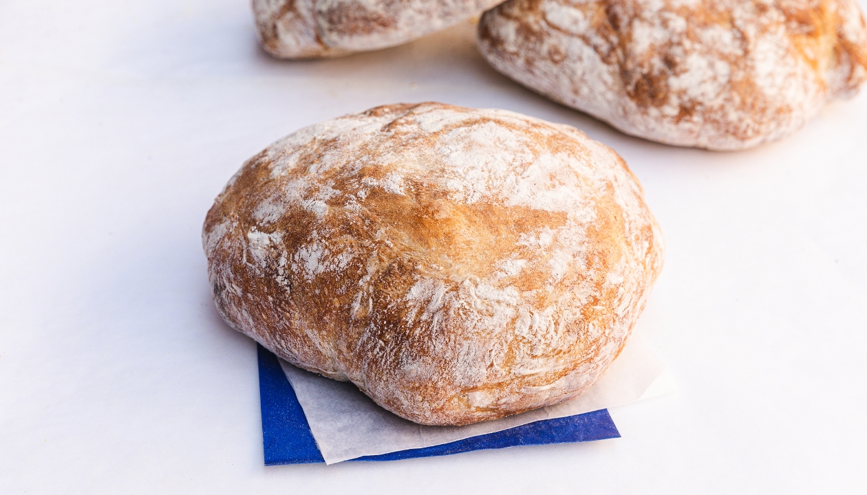 A Tuscan-style loaf that boasts a crusty exterior and a soft, chewy center. Great to dip in olive oil or use for panini. No fat, very low in salt.