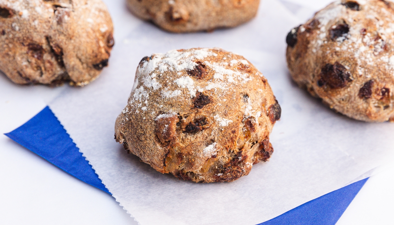 A dense whole wheat loaf, packed with walnuts and dark and golden raisins. Incredibly versatile, this bread pairs equally well with nut butter, jam or cheese.