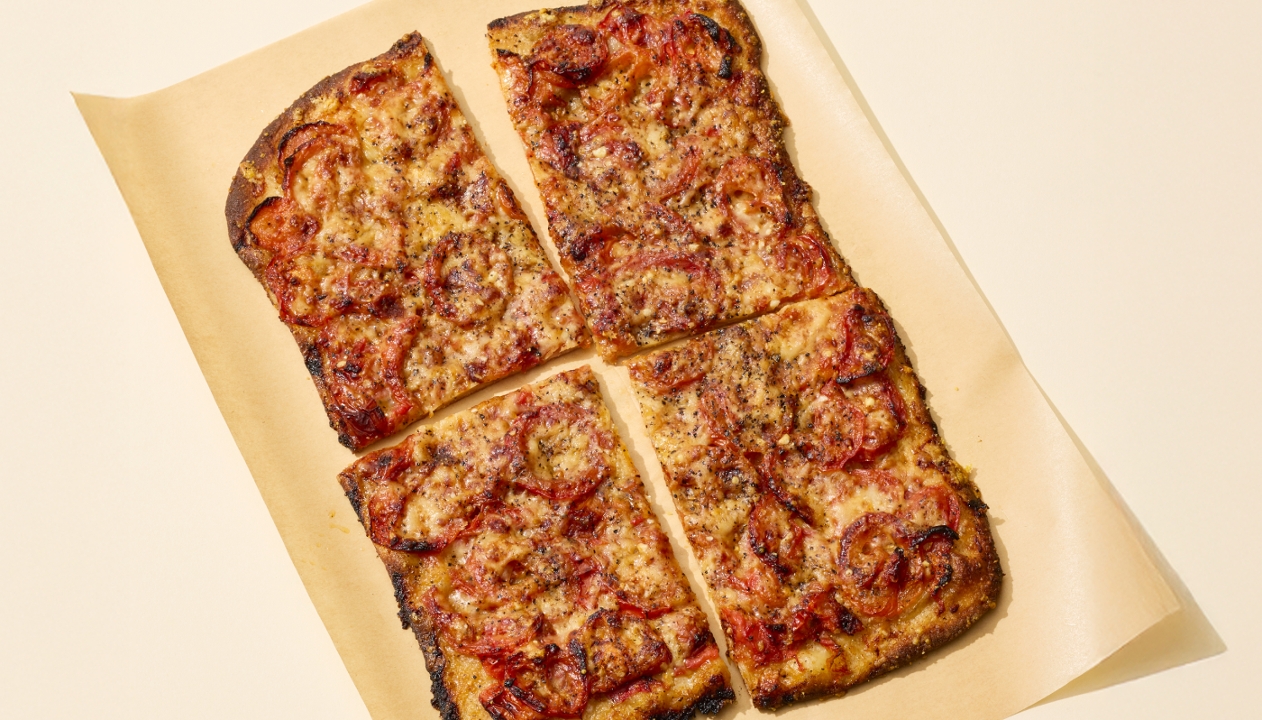 Roasted tomato and Parmesan Flatbread made with tomato marinade, olive oil, balsamic vinegar, and parmesano reggiano