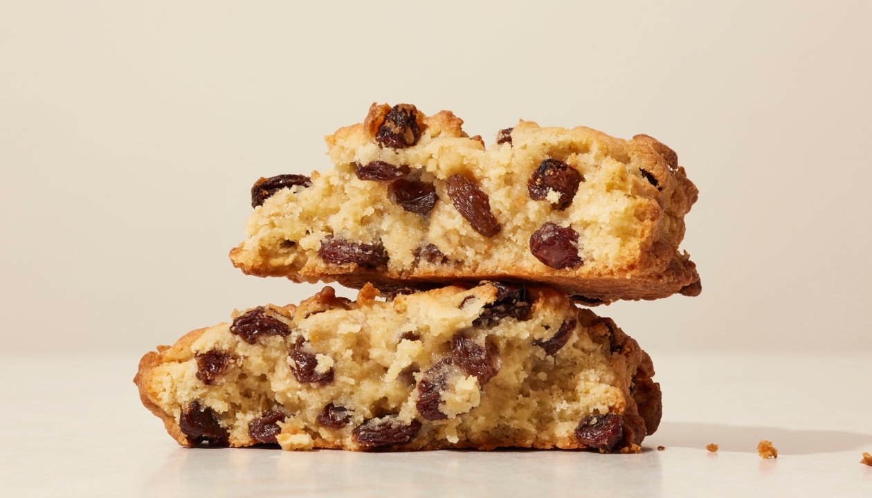 Huge mounds of oatmeal cookie – golden-brown on the outside yet delightfully soft on the inside – are crammed with plump baked raisins. Rich and buttery, these cookies are a decadent version of a traditional favorite.