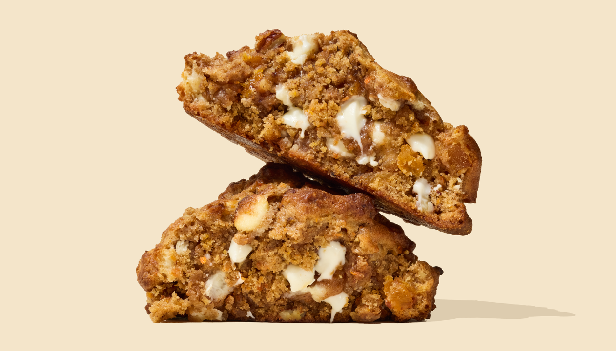 Inspired by the beloved classic dessert, our Carrot Cake Cookie is packed with freshly grated carrots, sweet apricots, creamy white chocolate chips, and crunchy pecans.