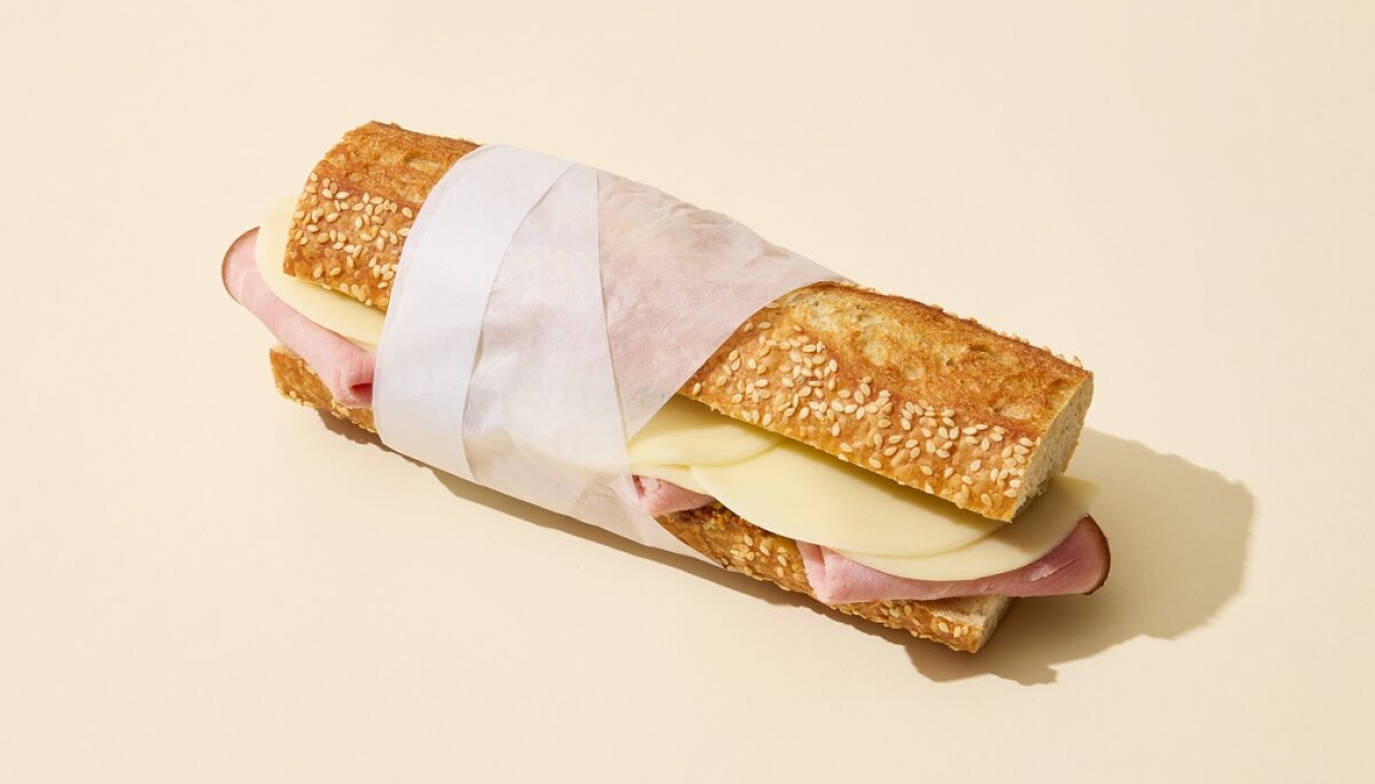 Black Forest Ham and Provolone cheese with whole grain dijon mustard on a sesame seed baguette.